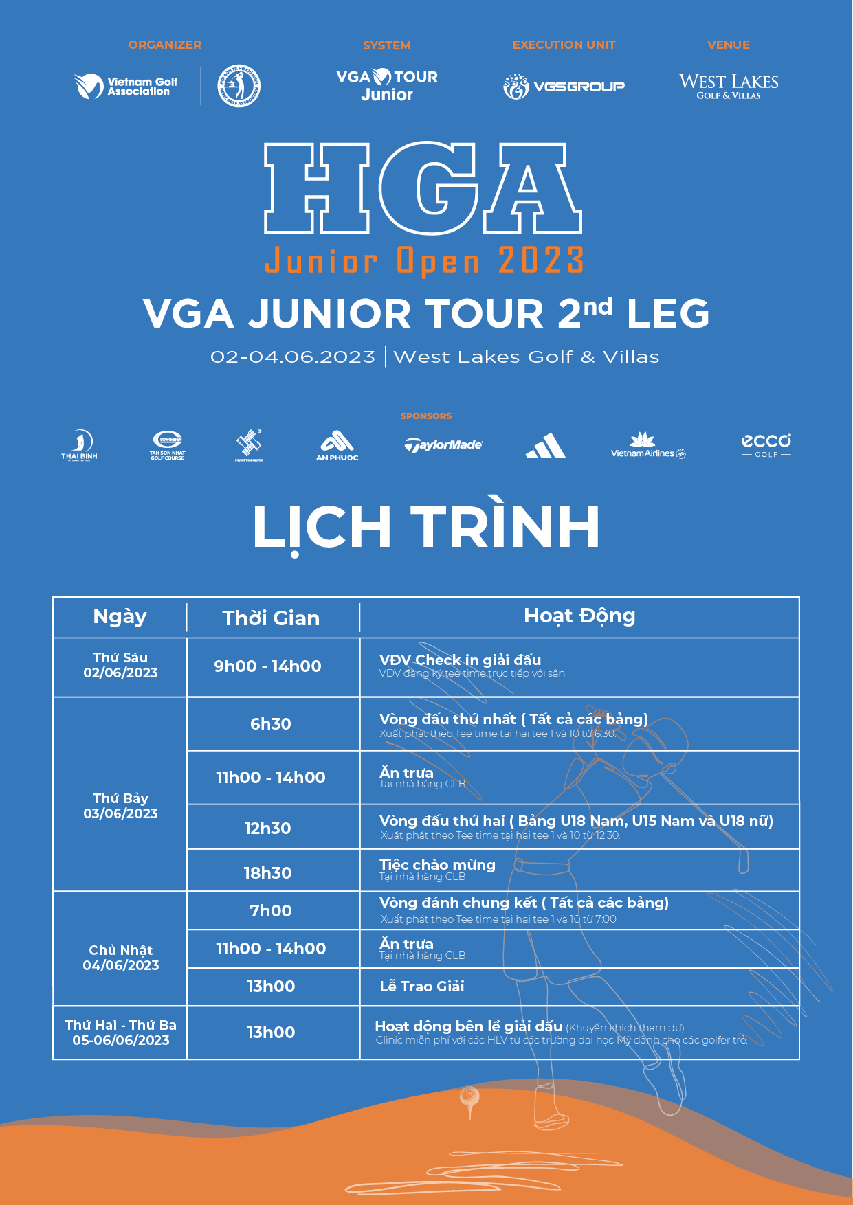 Chặng 2 VGA Junior Tour - Giải Vô Địch Gôn Trẻ Thành Phố Hồ Chí Minh Mở Rộng lần thứ VI sẽ diễn ra từ 02 - 04/06 tại sân West Lake Golf & Villas, Long An, Việt Nam. Với sự đồng hành của Sân West Lake Golf & Villas, giải đấu năm nay hứa hẹn sẽ là sân chơi để các VĐV trẻ tranh tài và nâng cao kĩ năng golf của mình.