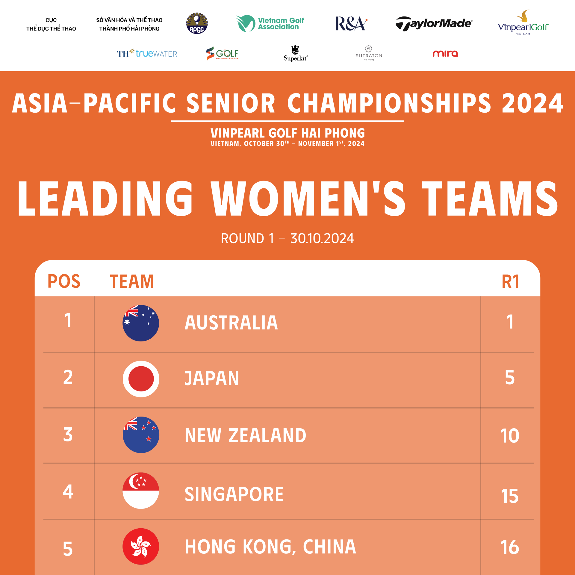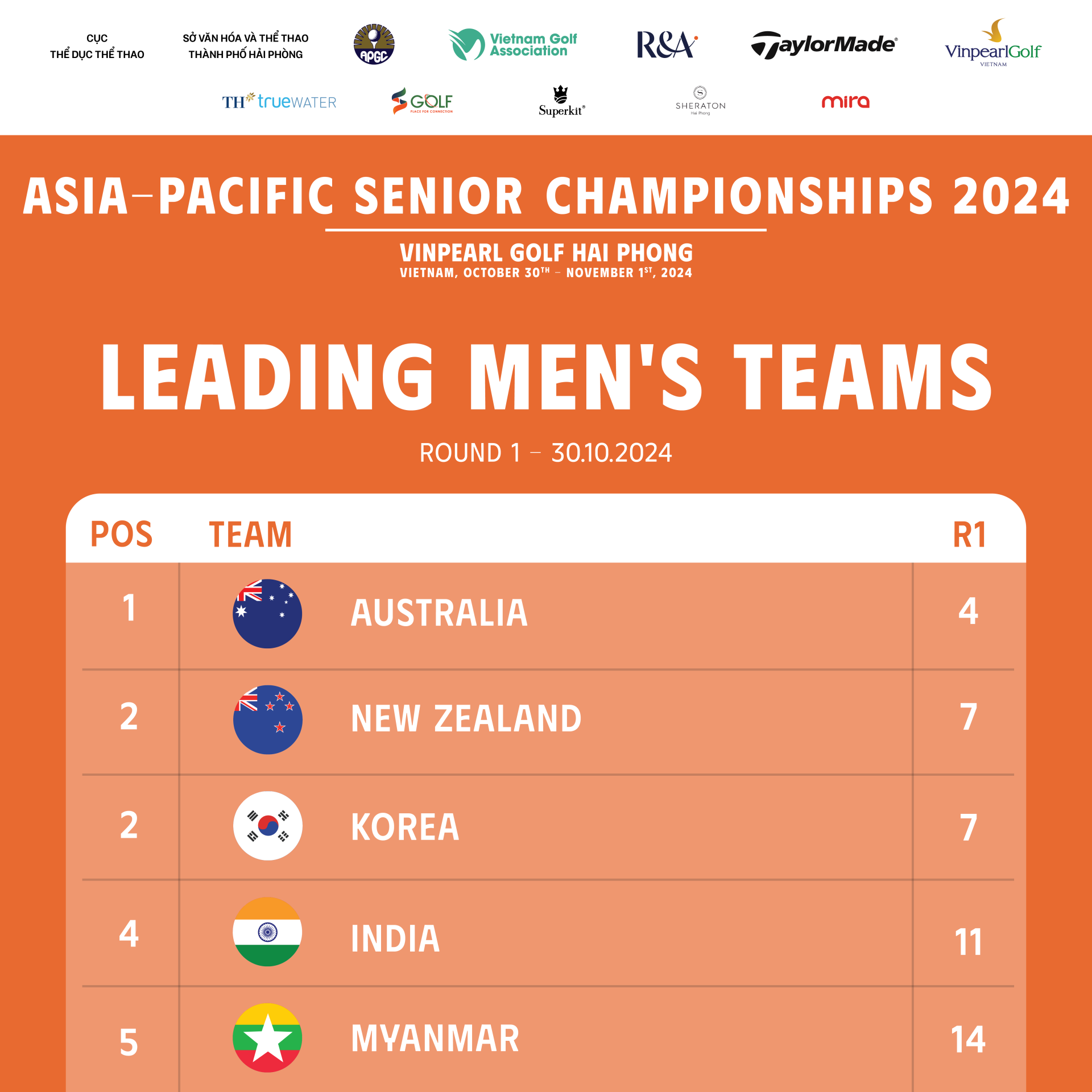 Kết thúc ngày thi đấu đầu tiên, đương kim vô địch - đội tuyển Úc đã xuất sắc dẫn đầu ở cả hai nội dung đồng đội nam và nữ. Ở nội dung đồng đội nam, hai đội New Zealand và Hàn Quốc đồng hạng nhì, tiếp theo là Ấn Độ và Myanmar lần lượt ở vị trí thứ tư và thứ năm. Trong khi đó, ở nội dung đồng đội nữ, đội Nhật Bản đứng ngay sau đội Úc, còn New Zealand, Singapore và Hong Kong (Trung Quốc) lần lượt xếp hạng ba, bốn và năm.