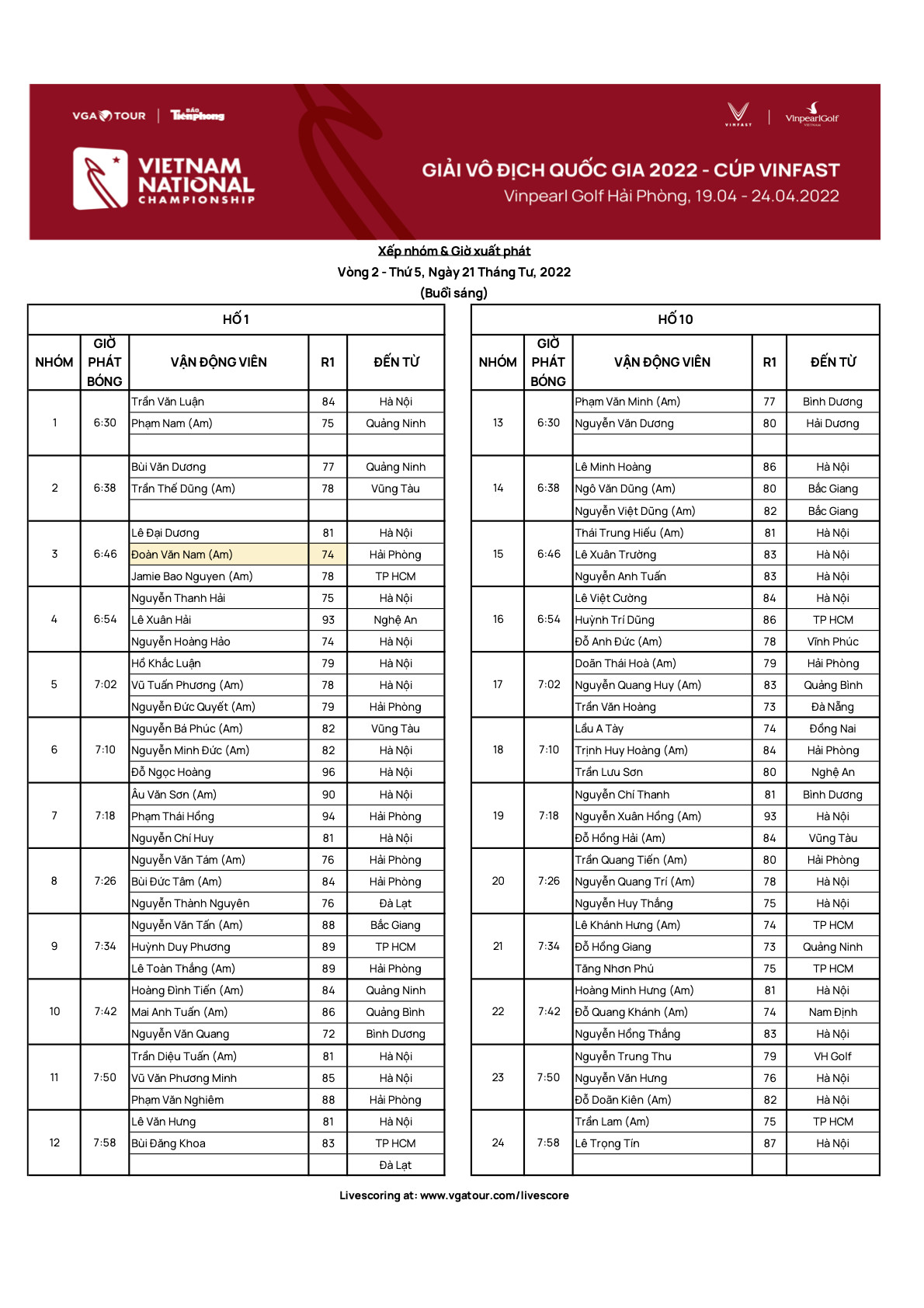 Ngày thi đấu thứ 2 của Giải Vô địch Quốc gia 2022 – Cúp VinFast sẽ tiếp tục được diễn ra vào ngày mai 21/4 với 2 phiên thi đấu, buổi sáng tee times sớm nhất lúc 6:30 và buổi chiều từ lúc 11:00.