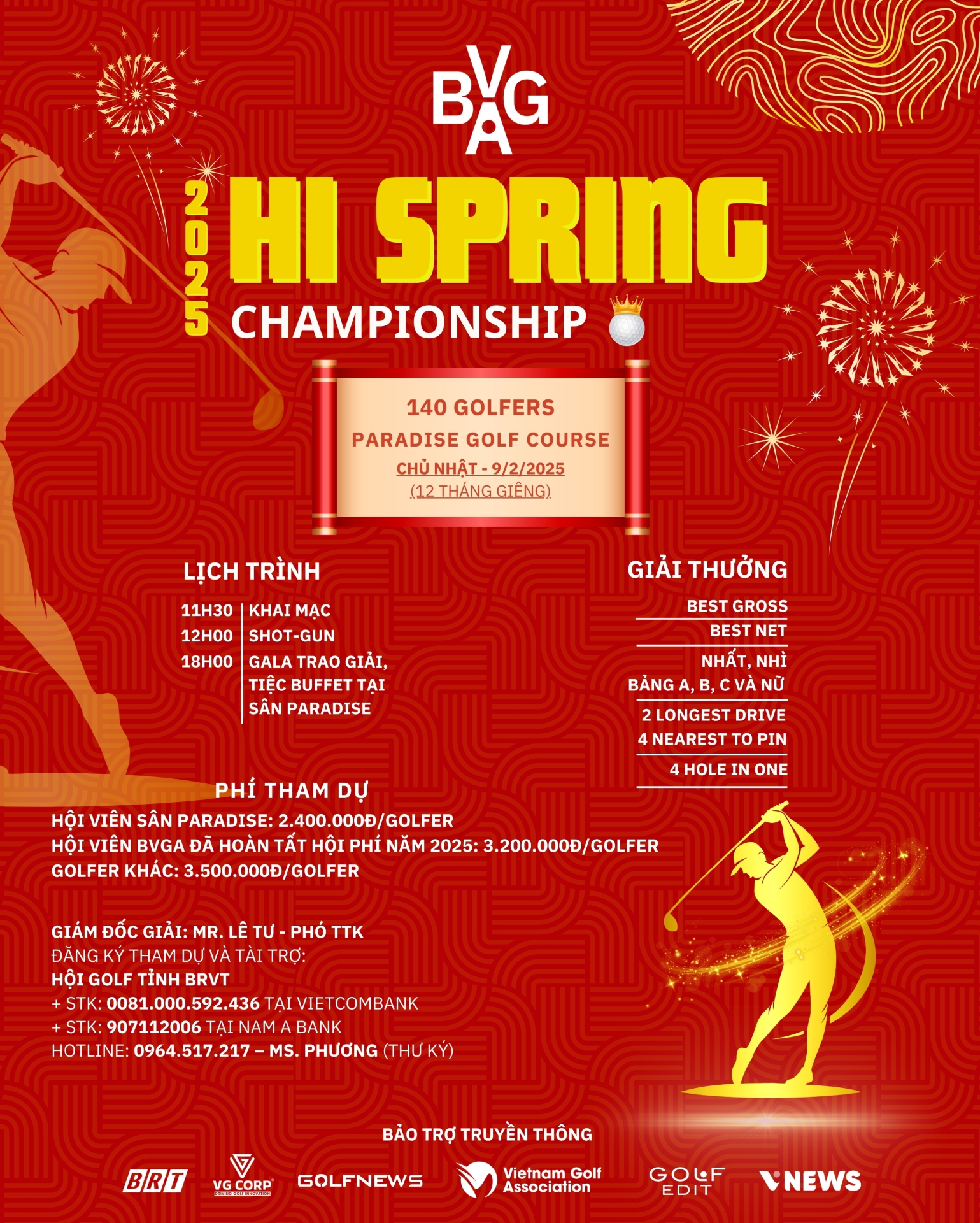 Không chỉ là một giải golf đơn thuần, Hi Spring Championship 2025 còn là dịp để các golfer tận hưởng những khoảnh khắc đáng nhớ bên bạn bè và mở màn một năm mới đầy may mắn, thành công. Tại đây, golfers sẽ có cơ hội trải nghiệm không khí thi đấu sôi động, cùng thăng hoa với những cú swing mạnh mẽ và thưởng thức tiệc gala vui vẻ ngoài trời. Các golfers cùng nâng ly chúc mừng năm mới, giao lưu với bạn bè và chia sẻ niềm đam mê golf trong một không gian thư giãn và ấm áp. Hiệp hội Golf Việt Nam hân hạnh đồng hành và bảo trợ cho giải đấu.