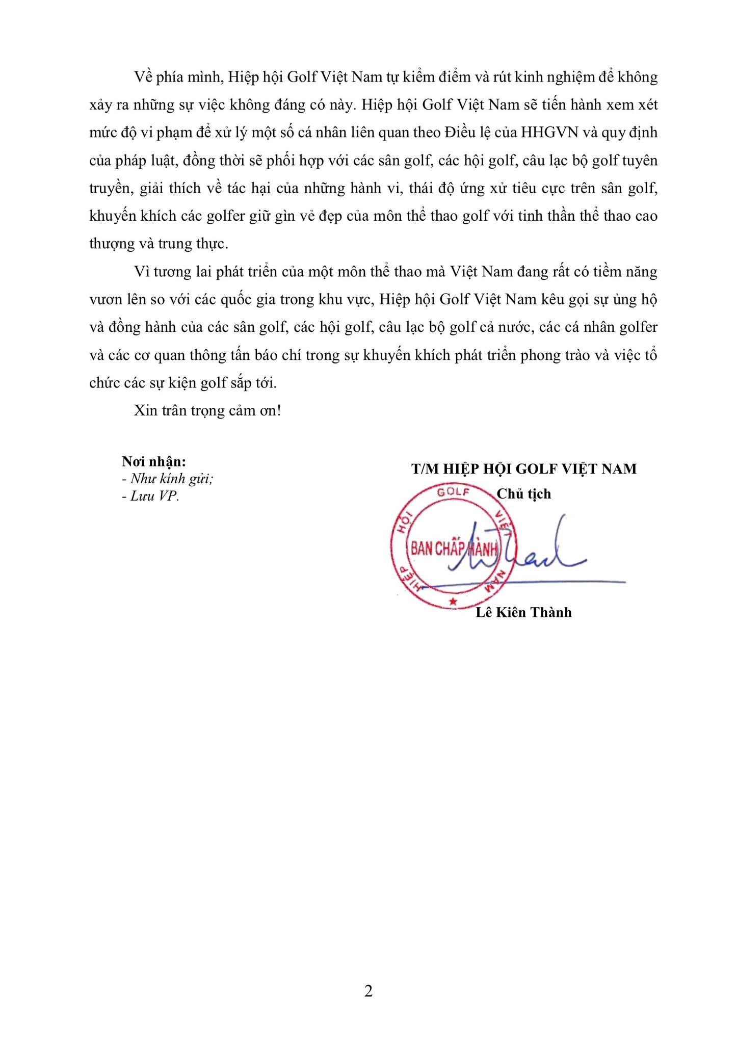 Về phía mình, Hiệp hội Golf Việt Nam tự kiểm điểm và rút kinh nghiệm để không xảy ra những sự việc không đáng có này. Hiệp hội Golf Việt Nam sẽ tiến hành xem xét mức độ vi phạm để xử lý một số cá nhân liên quan theo Điều lệ của HHGVN và quy định của pháp luật, đồng thời sẽ phối hợp với các sân golf, các hội golf, câu lạc bộ golf tuyên truyền, giải thích về tác hại của những hành vi, thái độ ứng xử tiêu cực trên sân golf, khuyến khích các golfer giữ gìn vẻ đẹp của môn thể thao golf với tinh thần thể thao cao thượng và trung thực.