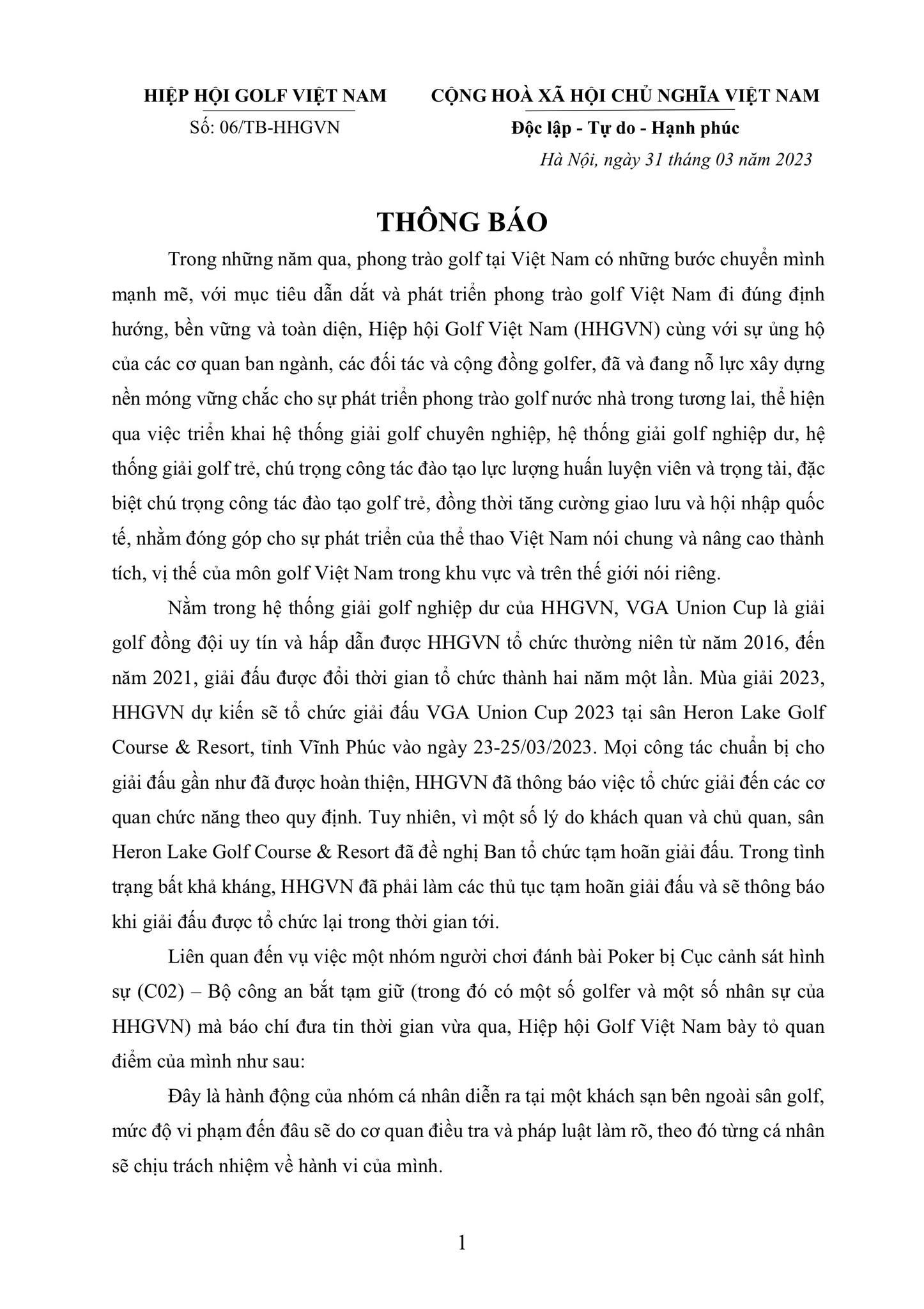Liên quan đến vụ việc một nhóm người chơi đánh bài Poker bị Cục cảnh sát hình sự (C02) – Bộ công an bắt tạm giữ (trong đó có một số golfer và một số nhân sự của HHGVN) mà báo chí đưa tin thời gian vừa qua, Hiệp hội Golf Việt Nam bày tỏ quan điểm của mình như sau: