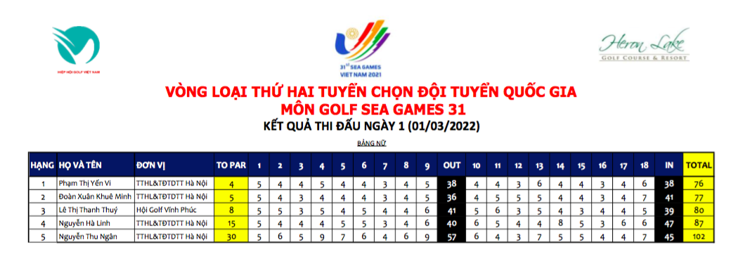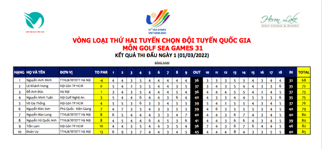 Ở bảng thi đấu nam, golfer Nguyên Anh Minh đứng đầu chỉ với 68 gậy, còn ở bảng nữ, vị trí dẫn đầu thuộc về tuyển thủ Phạm Thị Yến Vi với 76 gậy.