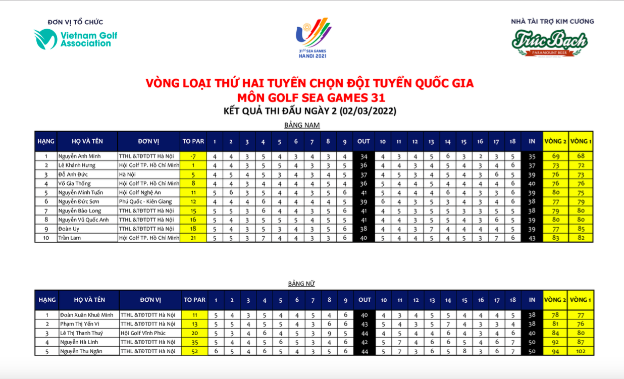 Ngày thi đấu thứ hai tiếp tục cho thấy phong độ của tuyển thủ Nguyễn Anh Minh với vị trí dẫn đầu bảng nam chỉ với 69 gậy, nhiều hơn ngày thứ nhất 1 gậy. Tại bảng thi đấu nữ, Đoàn Xuân Khuê Minh đã vượt Yến Vi để vượt ngôi đầu bảng.