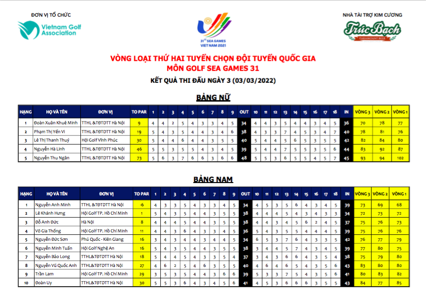 Tại bảng Nam trong ngày đấu thứ 3, golfer Lê Khánh Hưng đã có thành tích tốt nhất với 72 gậy, ít hơn Nguyễn Anh Minh (tạm thời giữ ngôi đầu bảng) 1 gậy. Còn tại bảng đấu nữ, Đoàn Xuân Khuê Minh vẫn tiếp tục giữ vững vị trí của mình với 70 gậy.