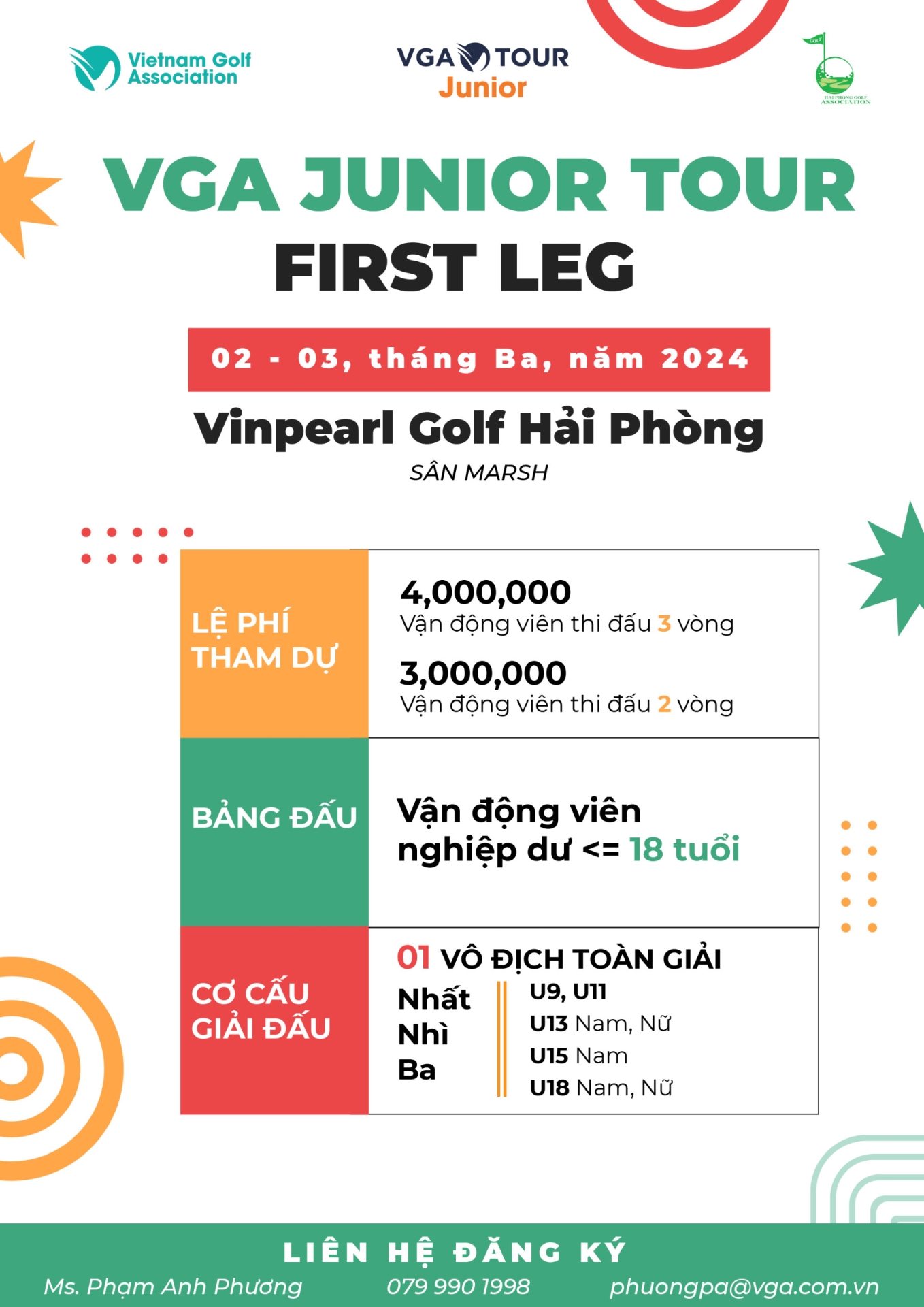 Năm 2024, Chặng 1 VGA Junior Tour - 1st Leg VGA Junior Tour 2024 sẽ chính thức khởi tranh từ ngày 02 đến ngày 03 tháng 3 năm 2024 tại sân Vinpearl Golf Hải Phòng. Đây là giải đấu mở màn cho chuỗi hệ thống giải golf dành riêng cho các golfer ở độ tuổi dưới 18 tuổi trong năm 2024. Nhằm kịp thời đáp ứng số lượng VĐV ngày càng tăng ở các lứa tuổi, giải đấu sẽ bao gồm các nhóm tuổi U9, U11, U13, U15 và U18. Kết quả thi đấu của các VĐV sẽ được cập nhật liên tục và chính xác tại Bảng xếp hạng VGA Junior, tạo đà phấn đấu cho các golfer nhí trong chặng đường theo đuổi niềm đam mê với bộ môn golf.