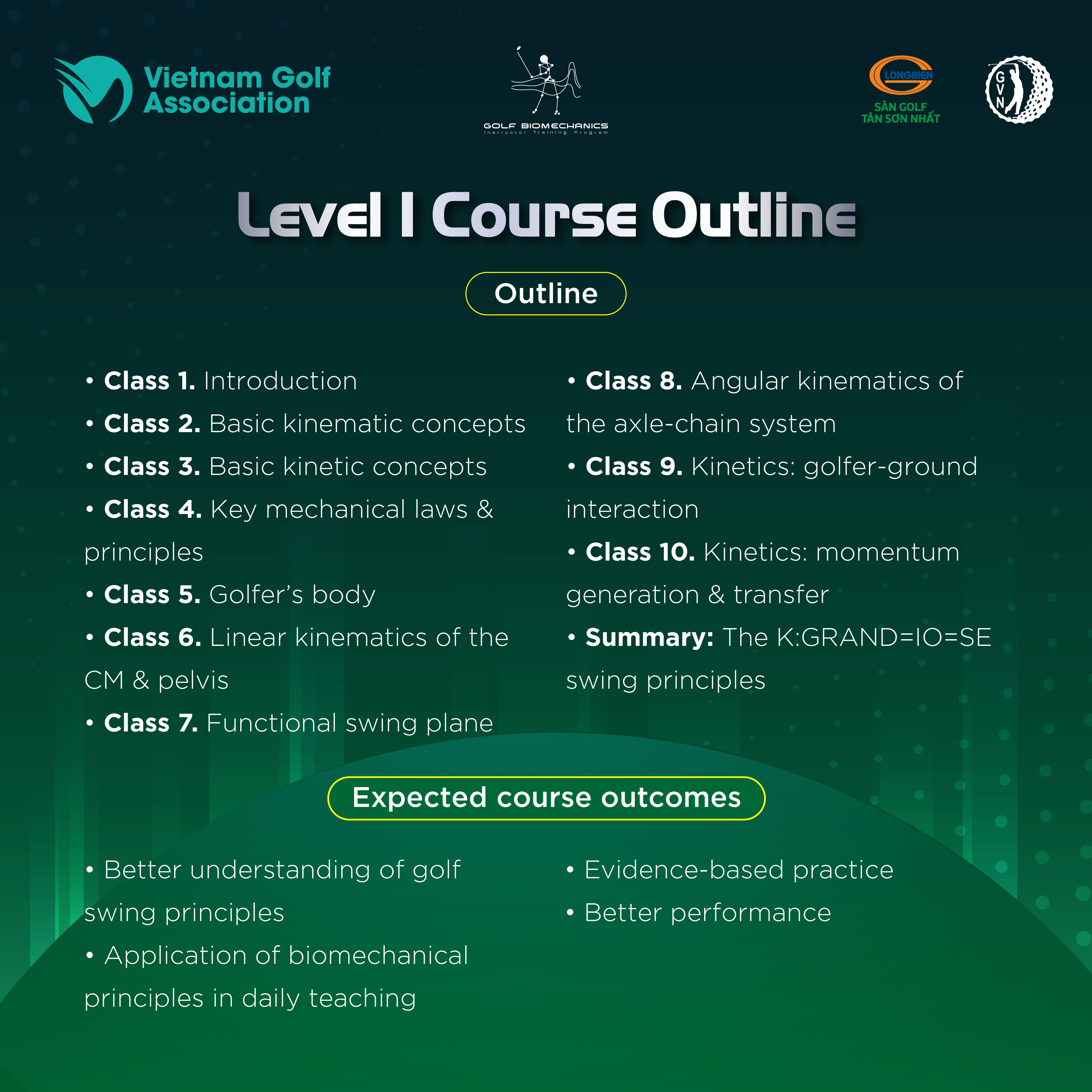 Hiện nay chỉ có duy nhất một khoá cơ sinh học được Hiệp hội Golf Việt Nam tổ chức diễn ra vào tháng 8 tới, học phần kiến thức quan trọng dành cho bất kì ai yêu và muốn gắn bó với golf.
