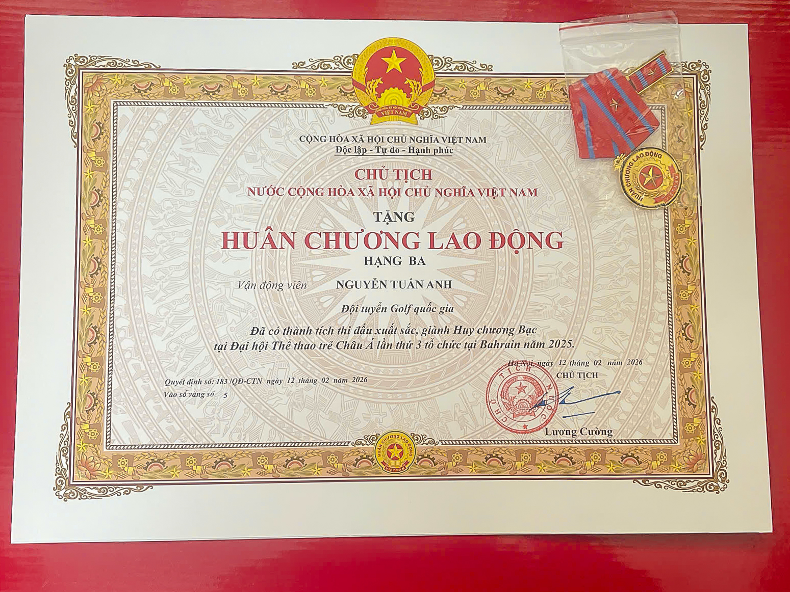 Huân chương Lao động là một trong những hình thức khen thưởng cấp Nhà nước, được trao cho các cá nhân có thành tích xuất sắc trong lao động, sáng tạo và đóng góp nổi bật cho sự phát triển chung. Trong lĩnh vực thể thao, danh hiệu này thường dành cho những vận động viên đạt thành tích cao tại các giải đấu quốc tế quan trọng, qua đó góp phần nâng cao vị thế quốc gia. Việc hai vận động viên trẻ được trao tặng Huân chương Lao động hạng Ba cho thấy thành tích tại Asian Youth Games 2025 không chỉ mang ý nghĩa chuyên môn, mà còn có giá trị lan tỏa và tạo dấu ấn trong hệ thống thể thao thành tích cao.