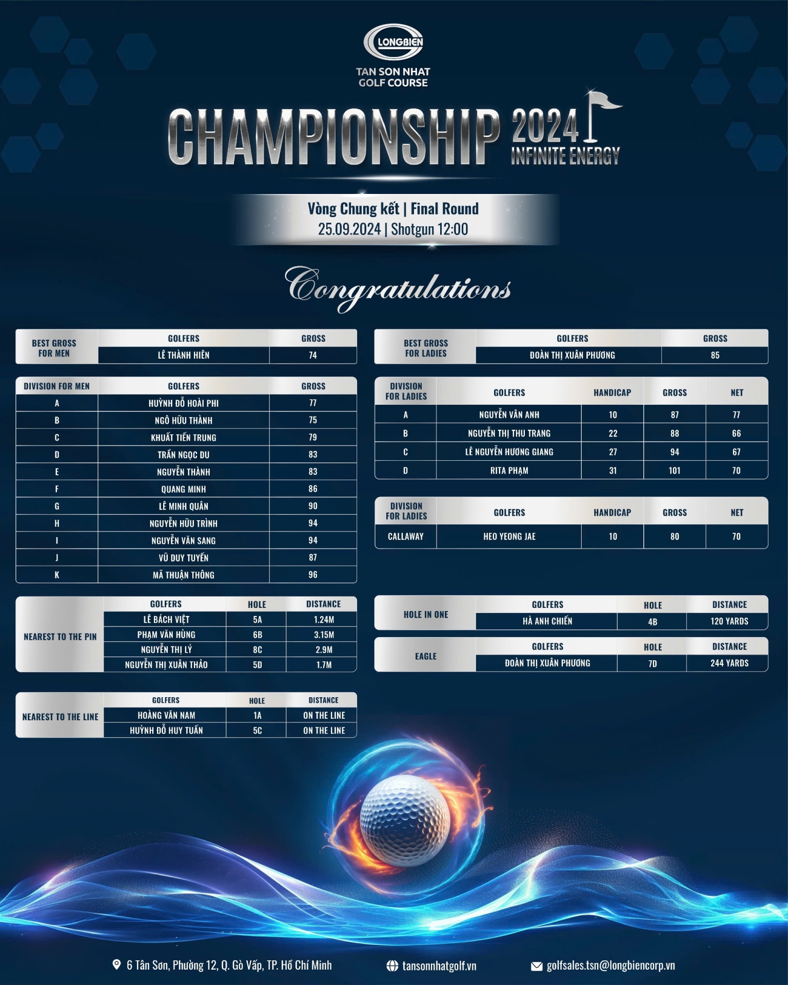Với màn trình diễn xuất sắc, golfer Lê Thành Hiên đã chinh phục ngôi vị cao nhất với điểm Best Gross ấn tượng là 74, trở thành nhà vô địch nam mùa giải năm nay. Ở hạng mục nữ, golfer Đoàn Thị Xuân Phương đã khắc tên trên bảng vàng với Best Gross là 85, chính thức bước lên bục vinh quang.