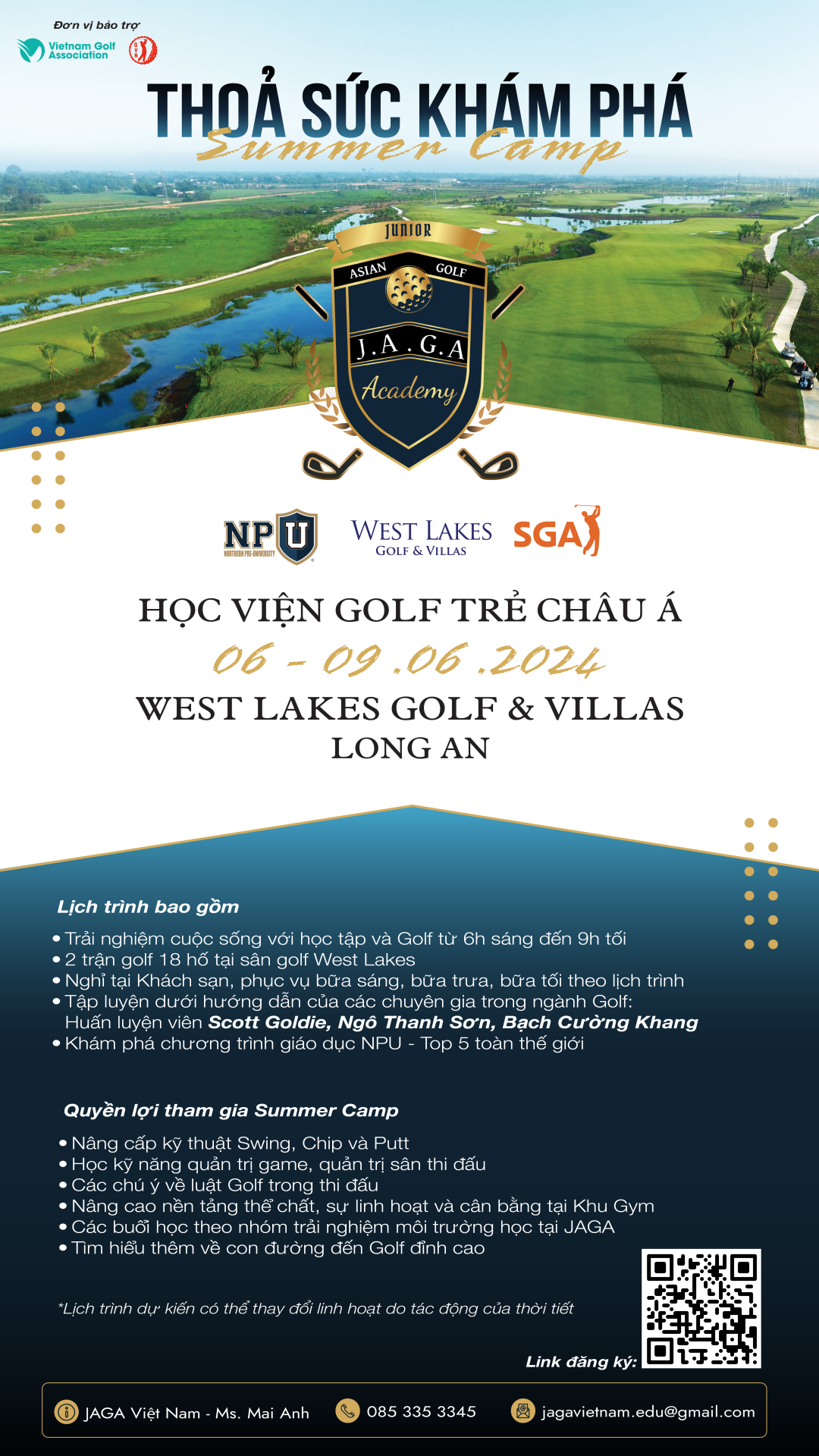 Sau trại hè tập huấn JAGA Summer Camp, tại sân golf West Lakes Long An sẽ diễn ra giải đấu Chặng 5 VGA Junior Tour từ ngày 10 - 12/06. Các VĐV đạt thành tích cao tại giải sẽ có cơ hội ghi tên mình vào bảng xếp hạng nghiệp dư thế giới (WAGR).