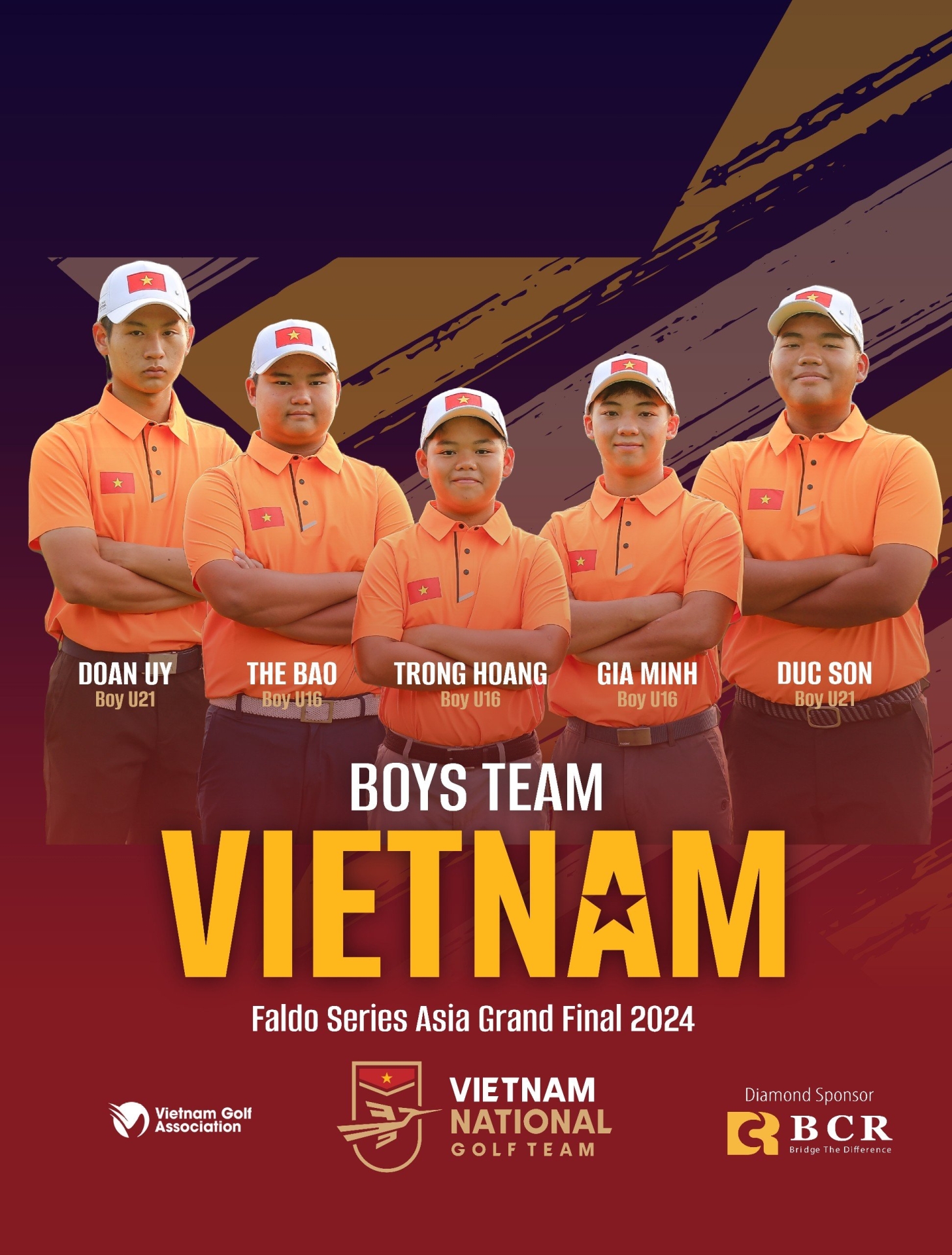 Đội tuyển Nam: Đoàn Uy, Nguyễn Đức Sơn, Nguyễn Trọng Hoàng, Trần Thế Bảo, Đỗ Dương Gia Minh