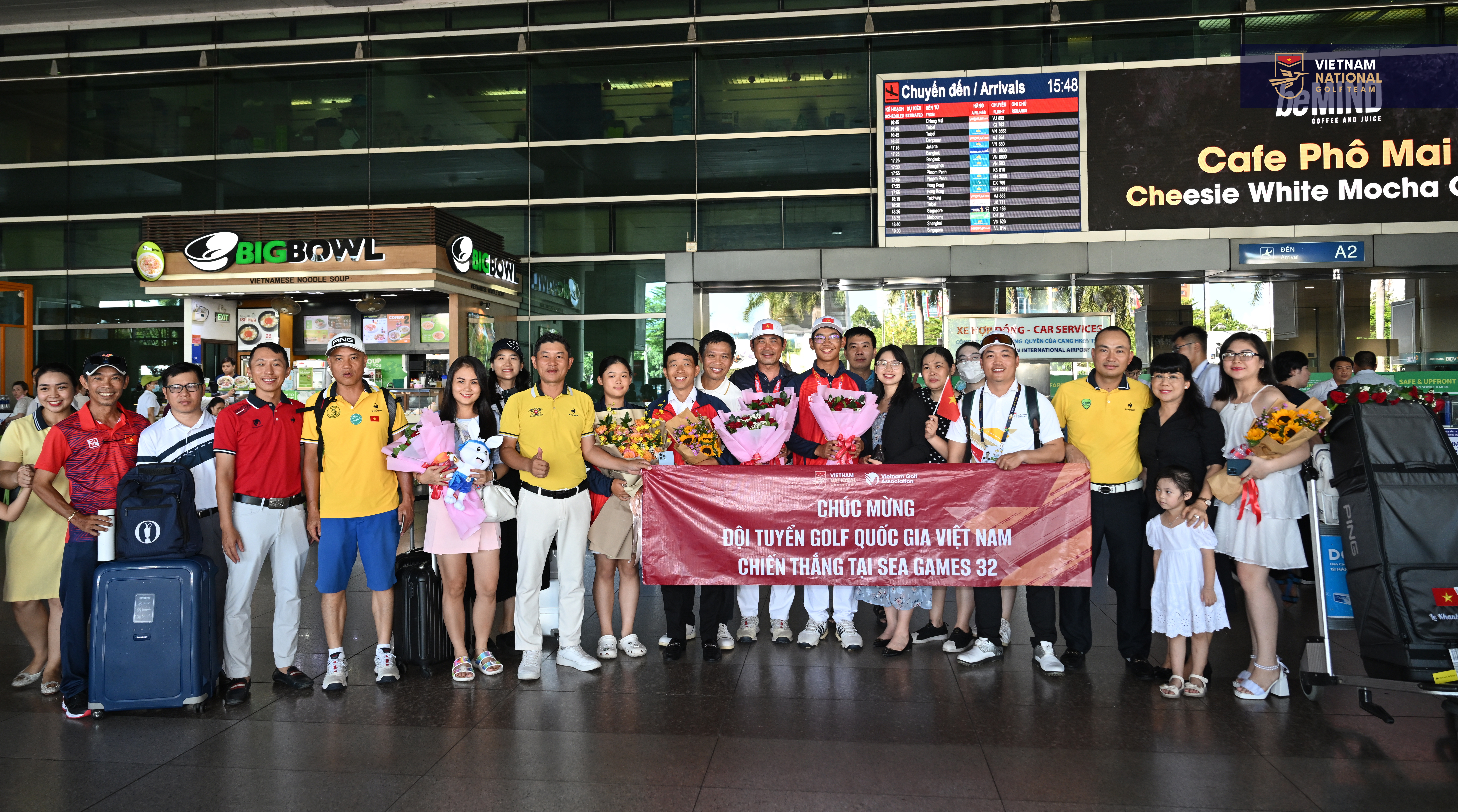 Các VĐV Lê Khánh Hưng, Thân Bảo Nghi cùng huấn luyện viên phó đội tuyển golf Việt Nam là ông Bạch Cường Khang, ông Nguyễn Gia Thuận - chuyên gia cơ sinh học, tâm lý cùng gia đình các vận động viên đã hạ cánh tại sân bay Tân Sơn Nhất, sau một kỳ SEA Games 32 thành công của Đội tuyển golf Việt nam tại Campuchia. Ra sân bay đón đoàn là đông đảo người chơi gôn tại thành phố Hồ Chí Minh và các tỉnh lân cận, cùng người nhà của vận động viên. Những bó hoa rực rỡ đã được trao cùng với những cái ôm chặt, ấm áp tình thân của người nhà, của bạn bè và người hâm mộ dành cho các VĐV. Luật sư Trần Duy Cảnh - Phó chủ tịch Hiệp hội Golf Việt nam, Phó Chủ tịch Hội gôn TP. HCM đã thay mặt các đơn vị, trao những bó hoa tươi thắm cho các VĐV và Ban huấn luyện đội tuyển.