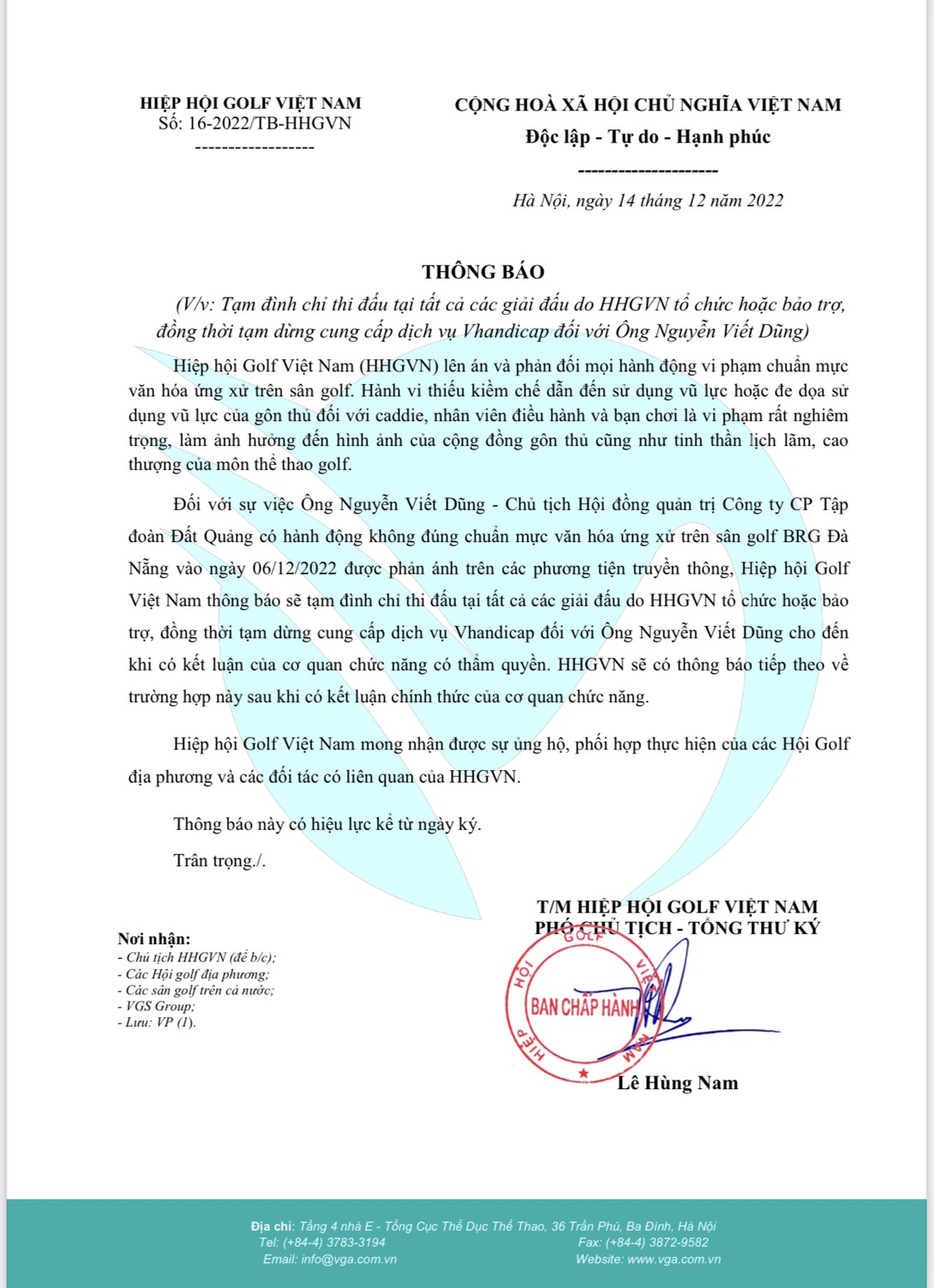 Theo thông báo số Số: 16-2022/TB-HHGVN: Đối với sự việc Ông Nguyễn Viết Dũng - Chủ tịch Hội đồng quản trị Công ty CP Tập đoàn Đất Quảng có hành động không đúng chuẩn mực văn hóa ứng xử trên sân golf BRG Đà Nẵng vào ngày 06/12/2022 được phản ánh trên các phương tiện truyền thông, Hiệp hội Golf Việt Nam thông báo sẽ tạm đình chỉ thi đấu tại tất cả các giải đấu do HHGVN tổ chức hoặc bảo trợ, đồng thời tạm dừng cung cấp dịch vụ Vhandicap đối với Ông Nguyễn Viết Dũng cho đến khi có kết luận của cơ quan chức năng có thẩm quyền. HHGVN sẽ có thông báo tiếp theo về trường hợp này sau khi có kết luận chính thức của cơ quan chức năng.