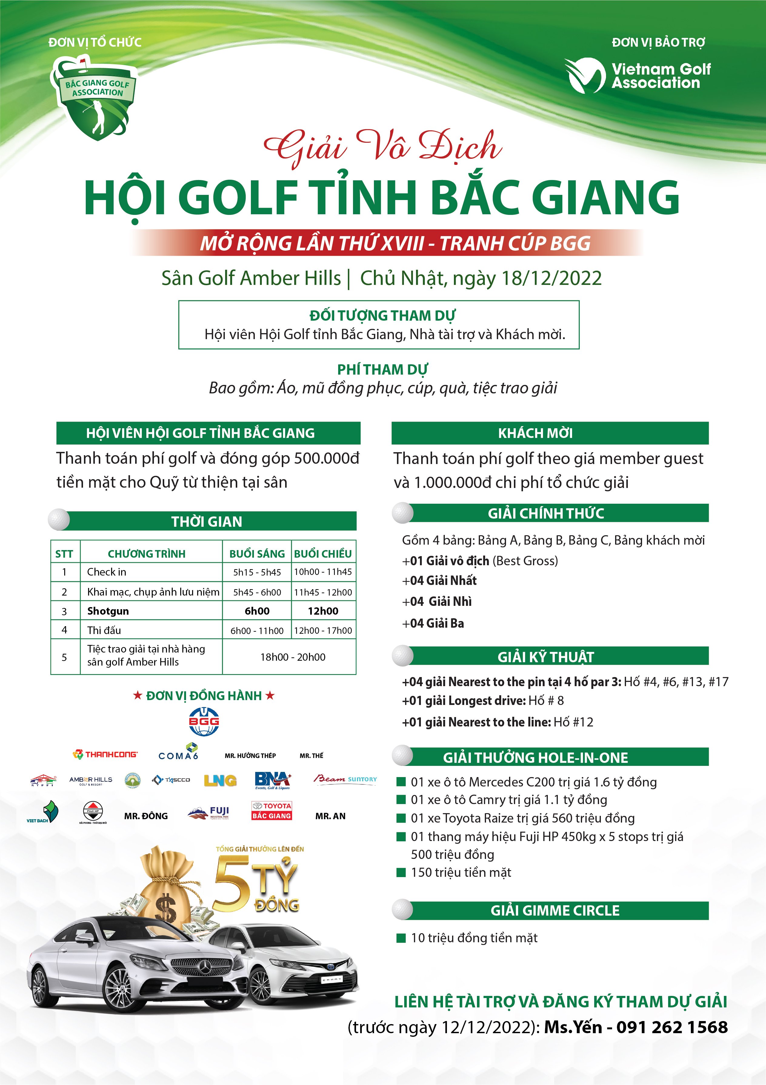 1) Tên giải: GIẢI VÔ ĐỊCH HỘI GOLF TỈNH BẮC GIANG MỞ RỘNG LẦN THỨ XVIII – TRANH CÚP BGG