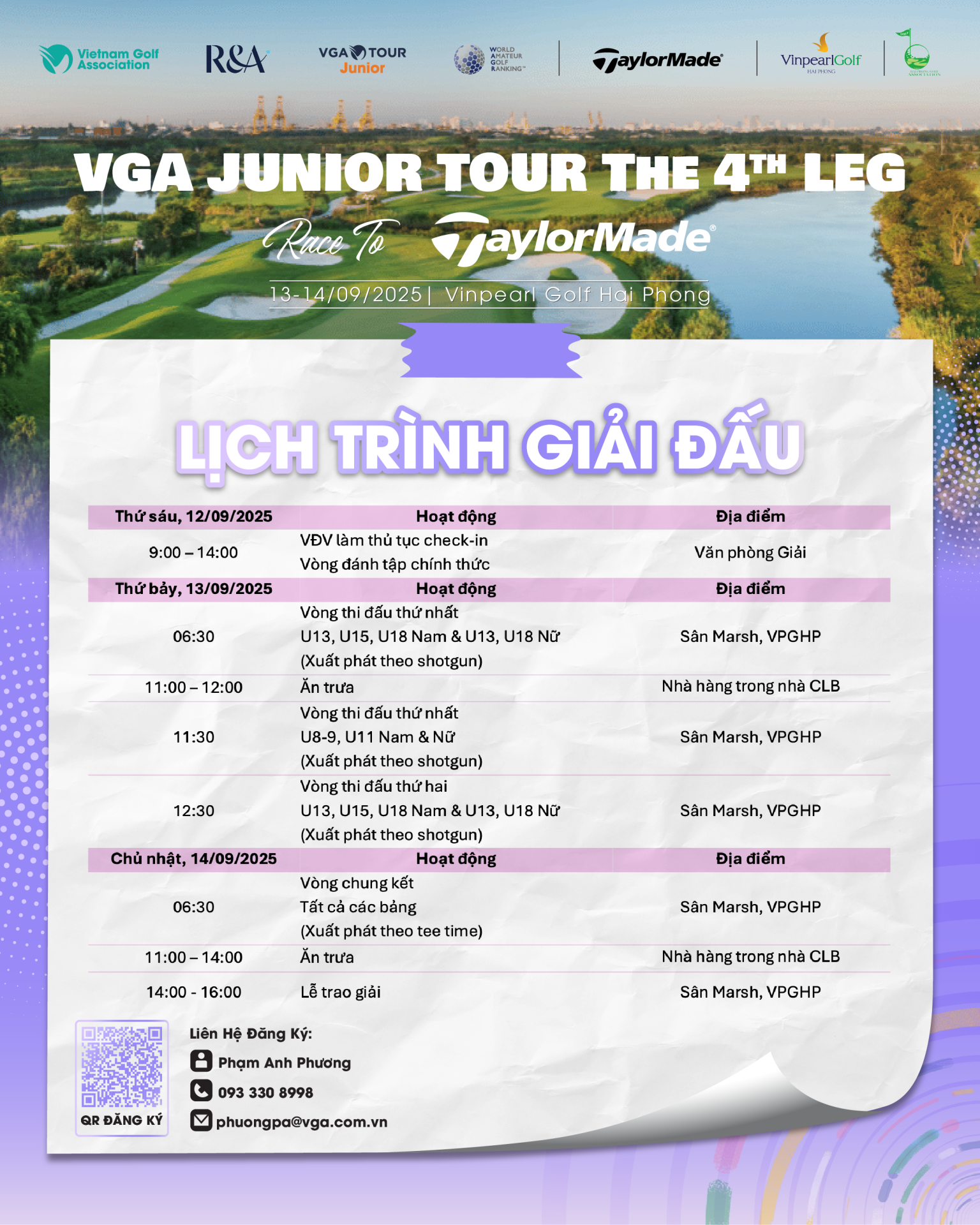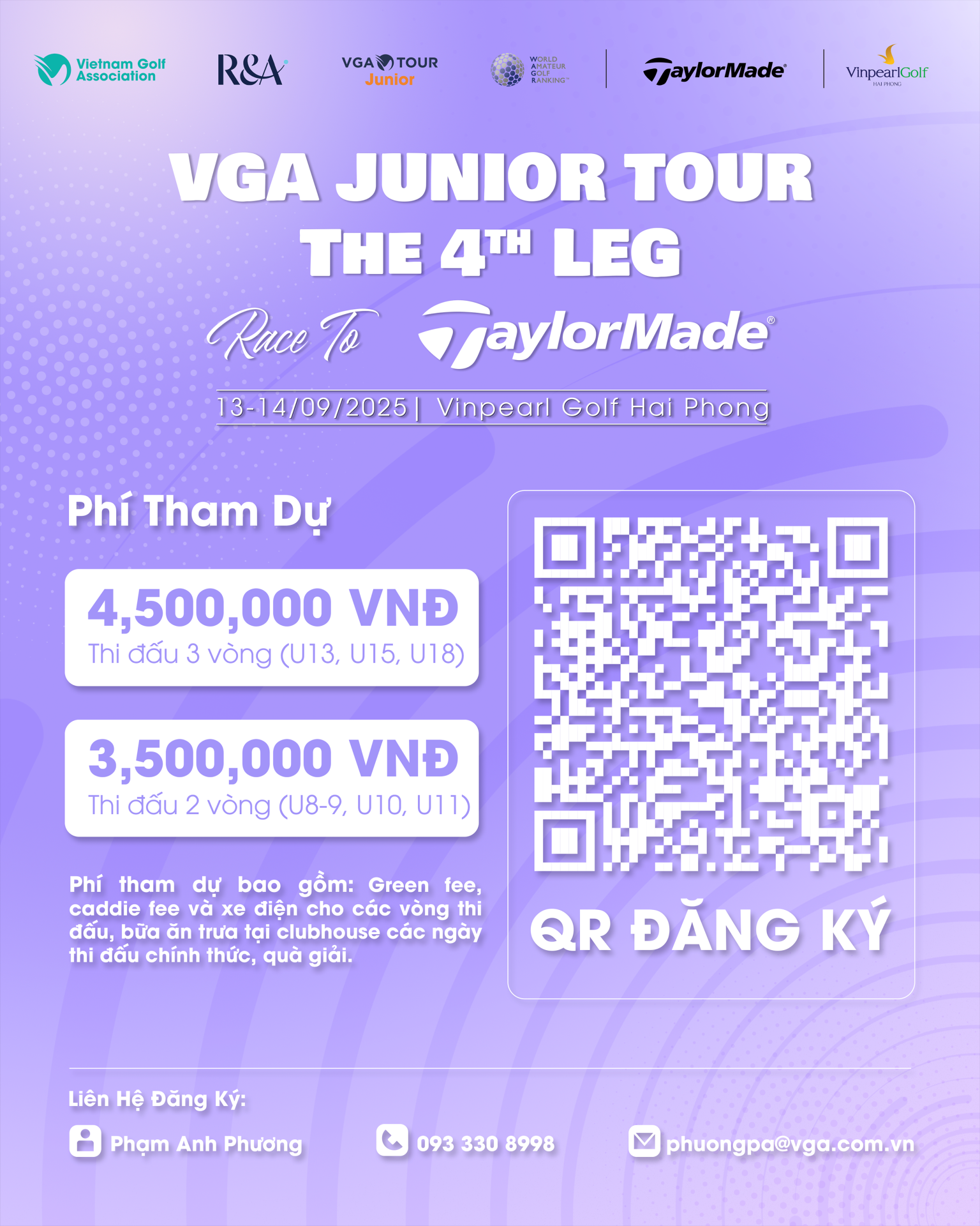 Sau một khoảng thời gian tạm hoãn, chặng 4 VGA Junior Tour 2025 Race to TaylorMade đã chính thức trở lại, và sẽ được tổ chức tại Vinpearl Golf Hải Phòng trong hai ngày 13 - 14/09/2025.