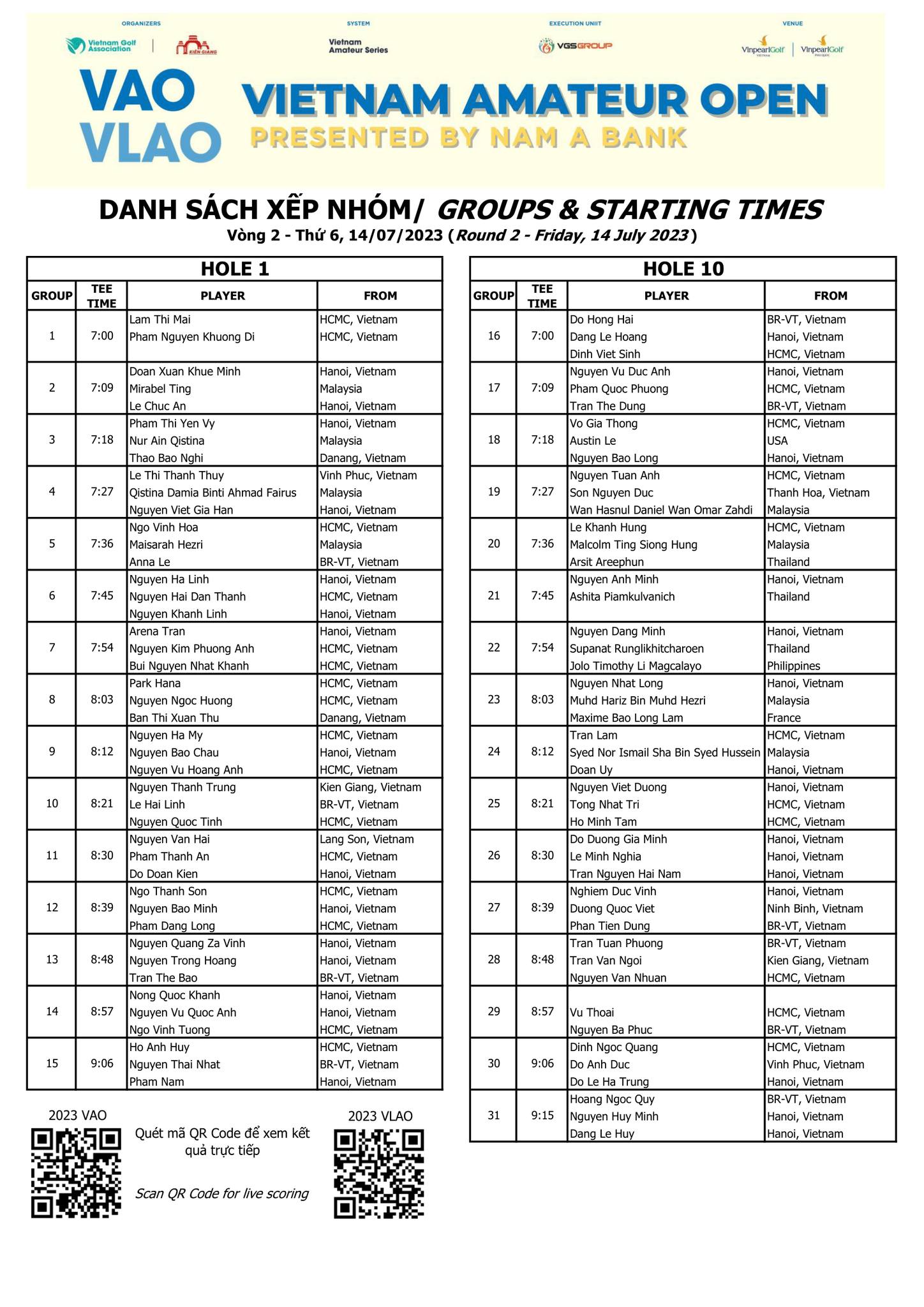 Với giải VLAO, vị trí dẫn đầu giải thuộc về Đoàn Xuân Khuê Minh, VĐV tuổi 20 đánh 72 gậy. Cô ghi 3 birdie, 3 bogey trong ngày thi đấu đầu tiên. Các vị trí 2, 3, 4 đều là các VĐV người Myanmar. Vị trí 2 là VĐV Mirabel Ting Ern Hui, cô bám sát VĐV dẫn đầu với khoảng cách 1 gậy, cô ghi 3 birdie và 2 bogey. Hạng 3 và 4 lần lượt là Maisarah Binti Muhanmad Hezri có điểm (+2) và Nur Ain Qistina Abdullah có điểm (+4).