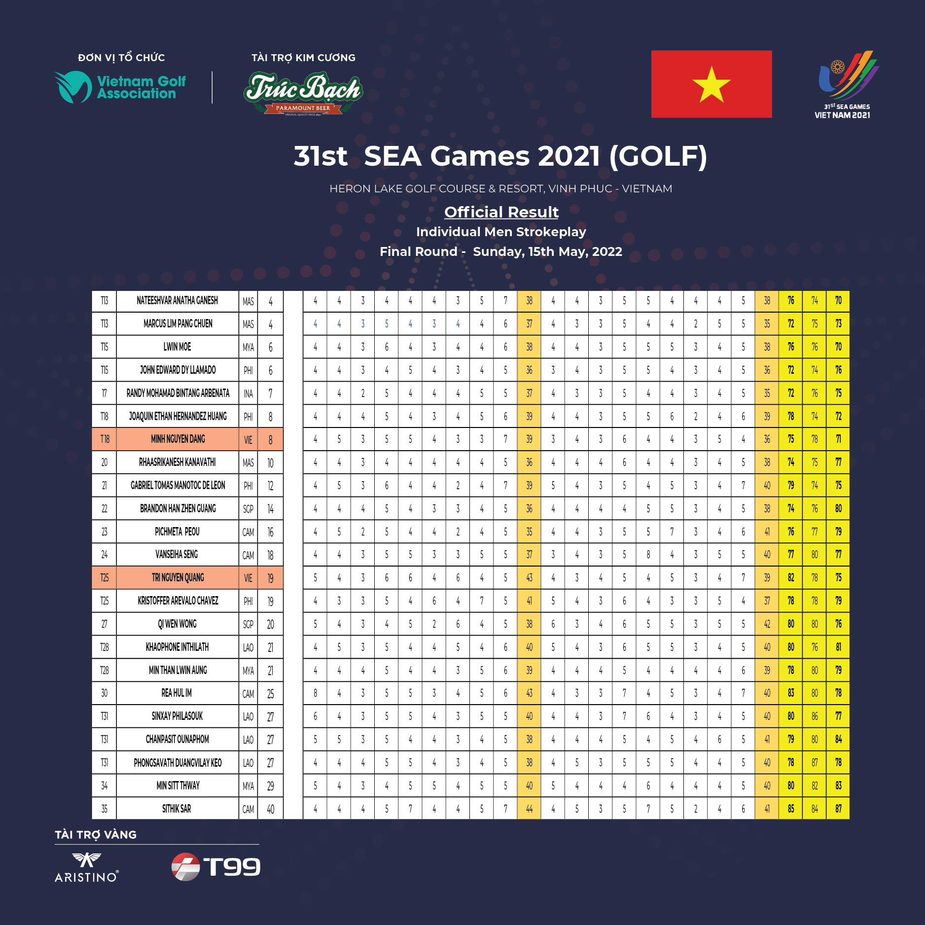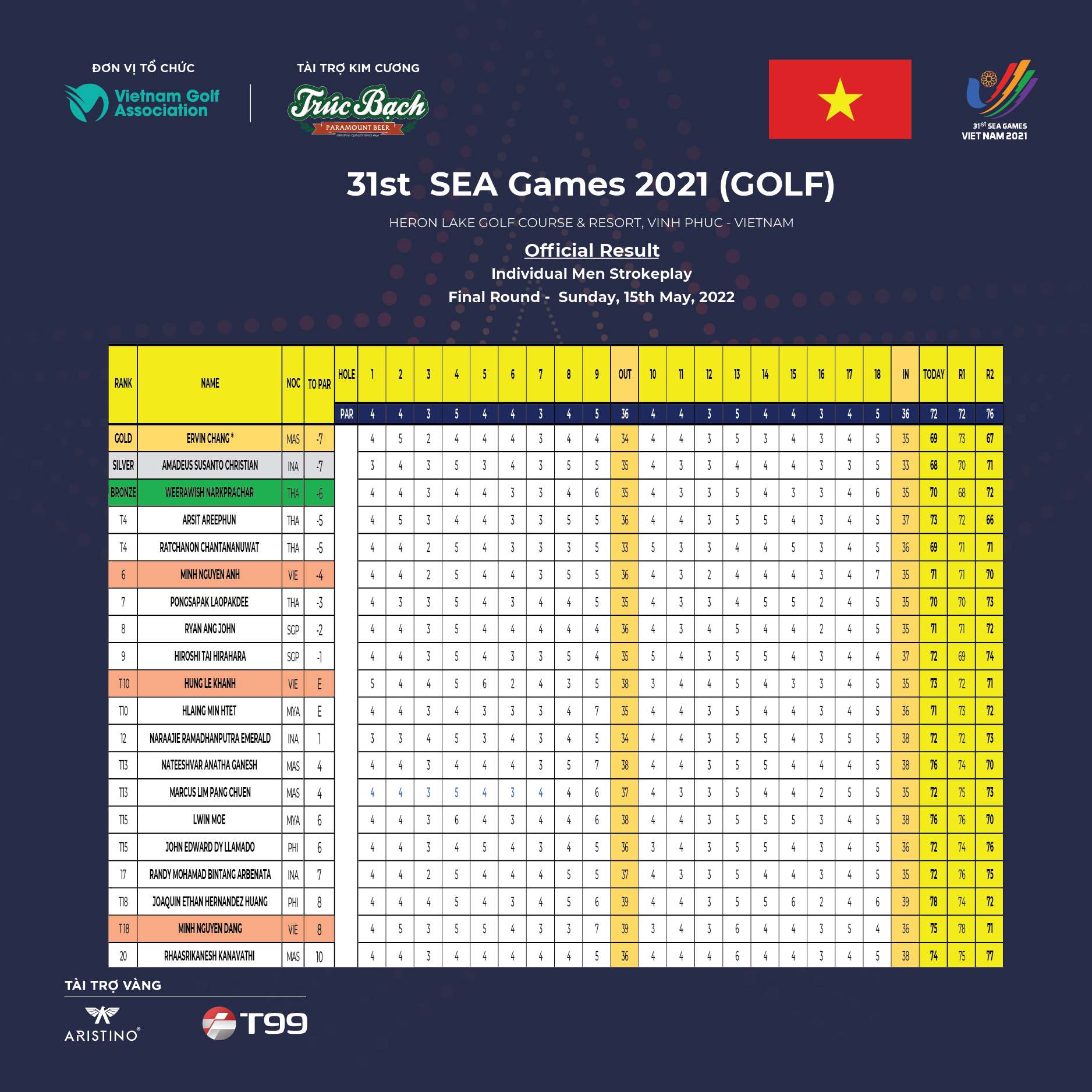 Ngày thi đấu cá nhân cuối cùng diễn ra đầy cảm xúc đặc biệt ở bảng thi đấu Nam. Tay golf người Malaysia Ervin Chang xuất sắc vươn lên trở thành nhà vô địch SEA Games 31 năm nay với -7 điểm.