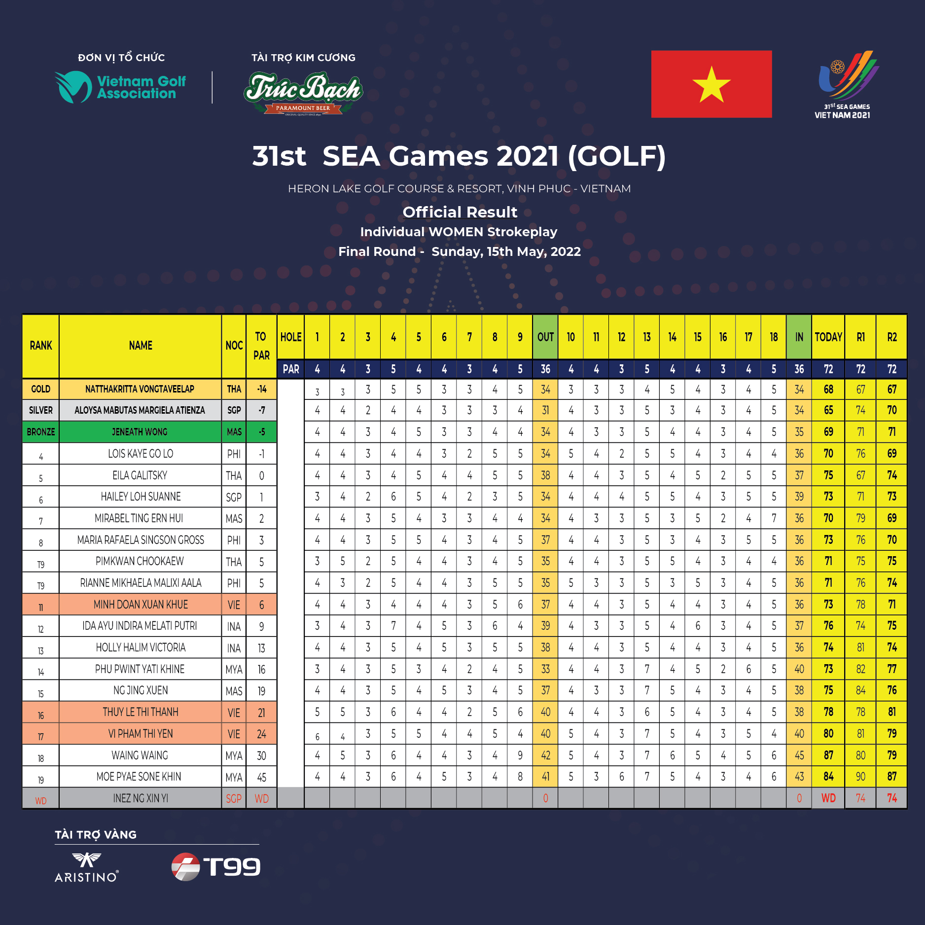 Về đích ở vị trí thứ hai là Atienza tay golf đến từ Singapore và Jeneath Wong giành huy chương Đồng người Malaysia. Không ngoài dự đoán, Thái Lan, Singapore và Malaysia là những quốc gia có vận động viên đoạt huy chương tại SEA Games 2022.