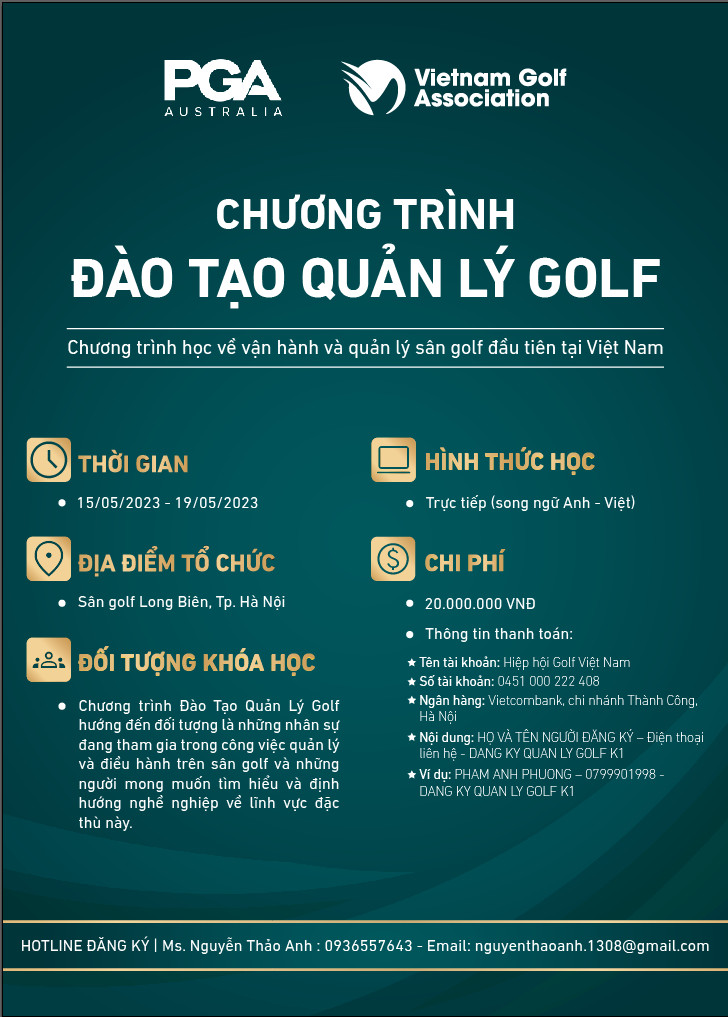 Trong những năm vừa qua, ngành golf đã phát triển mạnh mẽ tại Việt Nam cùng sự ra đời của nhiều sân golf trên khắp các tỉnh thành cả nước. Và việc sân golf hoạt động hiệu quả hay không phụ thuộc rất nhiều vào nhân sự quản lý và điều hành sân golf. Nhận thấy sự phát triển lớn mạnh của các sân golf tại Việt Nam trong những năm qua cũng như vai trò quan trọng của lực lượng nhân sự với chuyên ngành điều hành và quản lý sân golf, Hiệp hội Golf Việt Nam (VGA) sẽ phối hợp với PGA Australia tổ chức các khoá đào tạo ngắn ngày trong năm 2023.