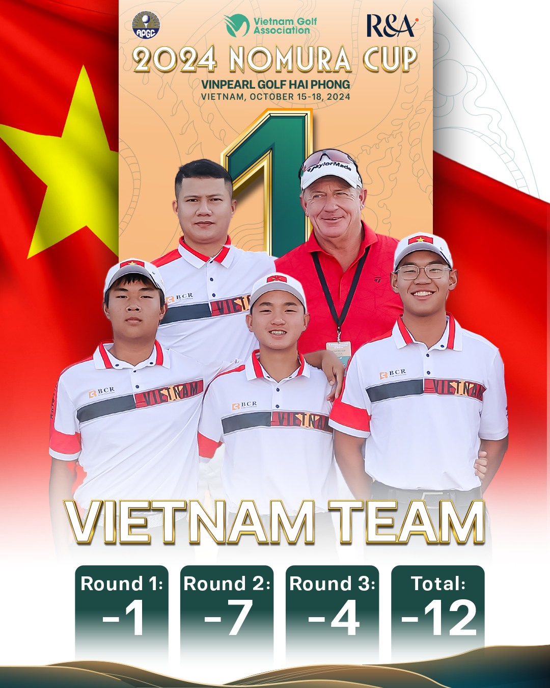 Ngày mai, 19 quốc gia và vùng lãnh thổ sẽ tiếp tục thi đấu vòng cuối cùng để tranh ngôi vô địch giải Nomura Cup 2024. Nếu như thành công đem về chức vô địch, Việt Nam sẽ có lần đầu tiên lên ngôi tại giải đấu sau 2 lần tham dự, và vị thế của nền golf nước nhà sẽ được khẳng định hoàn toàn trên bản đồ khu vực.